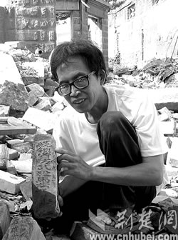 近日,武昌民間磚瓦收藏家劉文斌(上圖)在黃鶴樓下先賢街發(fā)現了一塊古磚,磚側一行銘文“統(tǒng)領省防武毅馬步□”字樣(下圖)。據研究武昌城民間文史考古家王昌旺考證,明代軍事建制在《明史》中均可查,然而有實物、遺址的證實卻不多。這塊明代古磚是武昌楚王府拱衛(wèi)軍高級指揮機關的遺物,對研究楚王府的“府兵制”起到了實物佐證作用。