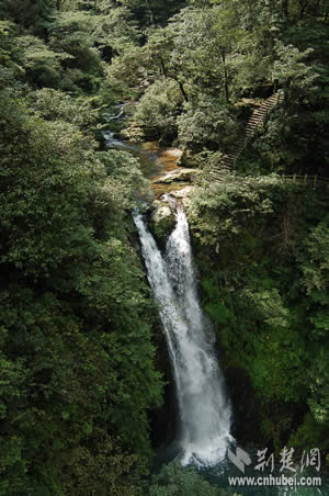 參觀完兩處紅色旅游景點(diǎn)之后,記者們順道觀光了龍?zhí)讹L(fēng)景區(qū)。龍?zhí)段挥诖钠何鞅逼吖,是近年來開發(fā)的以自然與人文景觀相結(jié)合的旅游風(fēng)景區(qū)。據(jù)介紹,當(dāng)?shù)氐奈迳窈邮驱執(zhí)丁拔逄妒似佟钡脑慈。溪水沖擊小井峽谷后,陡然跌落絕壁之下,又連續(xù)飛下四級(jí)斷崖,形成梯狀的五個(gè)氣勢(shì)磅礴的瀑布和深潭,這就是碧玉、金鎖、珍珠、飛鳳、玉女等五潭五瀑。細(xì)察五潭,碧水泱泱,樹影幢幢,崖壁如刀削斧鑿,崖腳怪石,汀芷競(jìng)秀,綠蔭覆蓋四周。仰觀五瀑,潭潭無俗水,瀑瀑似神女。