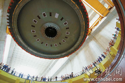 今年8月1日,三峽左岸電廠的最后一臺發(fā)電機組轉(zhuǎn)子吊入機坑(圖二)。令三峽建設(shè)者們感到自豪的是,這同樣是世界上最大的發(fā)電機組,不同的是其零部件國產(chǎn)化程度達到85%。