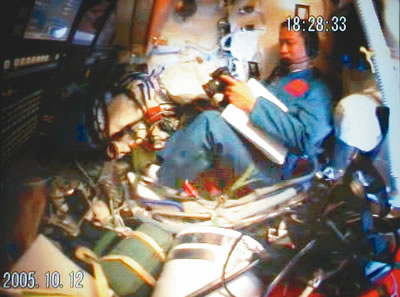 17時29分,航天員向地面飛控中心報告飛船工作正常,已做好開啟返回艙艙門的準備。在得到地面指揮員的指令后,費俊龍打開返回艙艙門,在聶海勝的幫助下進入軌道艙工作。