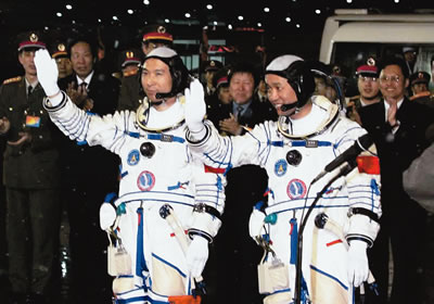 9時整,費俊龍、聶海勝乘坐神舟六號飛船在長征火箭的托舉下,飛向太空。