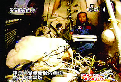 中午12時(shí)35分,神舟六號飛船正飛越我國上空,在雷鳴般的鞭炮聲中,慶祝航天英雄聶海勝41歲生日的儀式正式開始,中央電視臺同步直播。