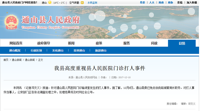 據(jù)通山縣委宣傳部通報:2017年12月8日中午,通山縣人民醫(yī)院門診輸液室發(fā)生打人事件 ,通山縣公安局及時出警調(diào)查取證。事件發(fā)生后,通山縣委、縣政府高度重視,組建專班進行處置,召集縣政府應急辦、 公安局、衛(wèi)計局、縣人民醫(yī)院等部門負責人會議:由縣人民醫(yī)院院長成忠了負責組建醫(yī)療專班,做好治療護理工作;由縣 人民政府副縣長金大德負責組建公安調(diào)查專班,確保處置及時快速、公平公正。該事件正在調(diào)查處置中,處置結(jié)果將及時 向社會公布。