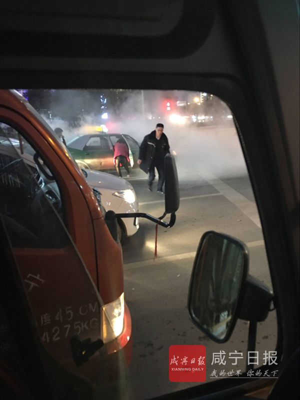 11日傍晚6時10分許, 中交資管湖北區(qū)域管理總部機(jī)關(guān)司機(jī)葛宏斌駕駛公司車輛,行至銀泉大道路與咸寧大道交叉口等紅燈。此時,他突然看見,同在此路口最左邊車道一輛出租車右前輪起火了。