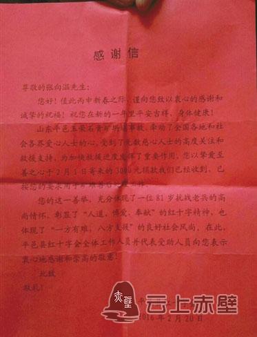 “尊敬的張向溫先生,您寄來的3000元捐款我們已經(jīng)收到,在此,平邑縣紅十字會(huì)全體工作人員并代表受助人員向您表示衷心地感謝和崇高的敬意……”這是山東省平邑縣紅十字會(huì)于2016年給張向溫寄的感謝信中的一段話。