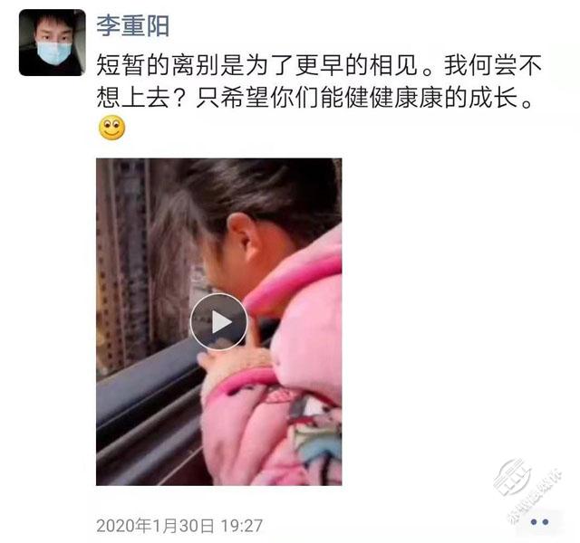 李重陽是中心消殺隊伍中的一員,1月29日,正值大年初五,已經(jīng)近10天沒回家的他接到了到自己所住小區(qū)開展消殺工作的任務。所有工作完成后,他只能在樓下?lián)芡ㄒ曨l,遠遠的看了一眼妻子,聽著兒女叫了一聲“爸爸”。當天,李重陽發(fā)了這樣一條朋友圈:“短暫的離別是為了更早的相見。我何嘗不想上去?只希望你們能健健康康的成長?!崩钪仃栔皇浅啾诩部乇姸嗄贻p消殺隊員的一個代表。很多人無聊的“家”,正是他們一線疫情防控人員想回卻回不去的“家”。