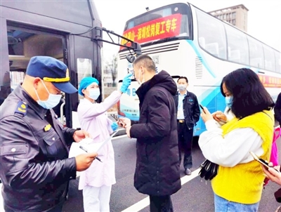 檢查身份信息、核驗(yàn)健康綠碼、監(jiān)測體溫、消毒……在現(xiàn)場工作人員的組織下,所有返崗復(fù)工人員有序上車。