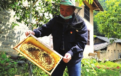 二組王必珍,今年70歲,是建檔立卡貧困戶。1990年右手截肢,靠養(yǎng)幾箱蜜蜂度生,并不斷投資蜂業(yè)。他介紹,養(yǎng)蜂是個好產業(yè),他雖然手不方便,但活兒不累。他與記者算起賬。他說,一個蜂箱有5個框,一個框搖糖1到1.5斤。一個箱一年搖糖3到4次,每斤糖按50元計算,20個箱就是2萬多元。深山無污染,一年四季有蜜源,九月黃、牛藤、勾藤、芙蓉花等,就是冬天,也有柃木開花。