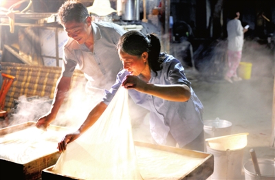 20日晚,崇陽(yáng)縣高枧鄉(xiāng)中山村,楊仕典和黃連夫妻倆正在忙著打豆腐。夫妻倆本是金塘鎮(zhèn)黃沙村人,2008年舉家搬遷至這里做豆腐生意。