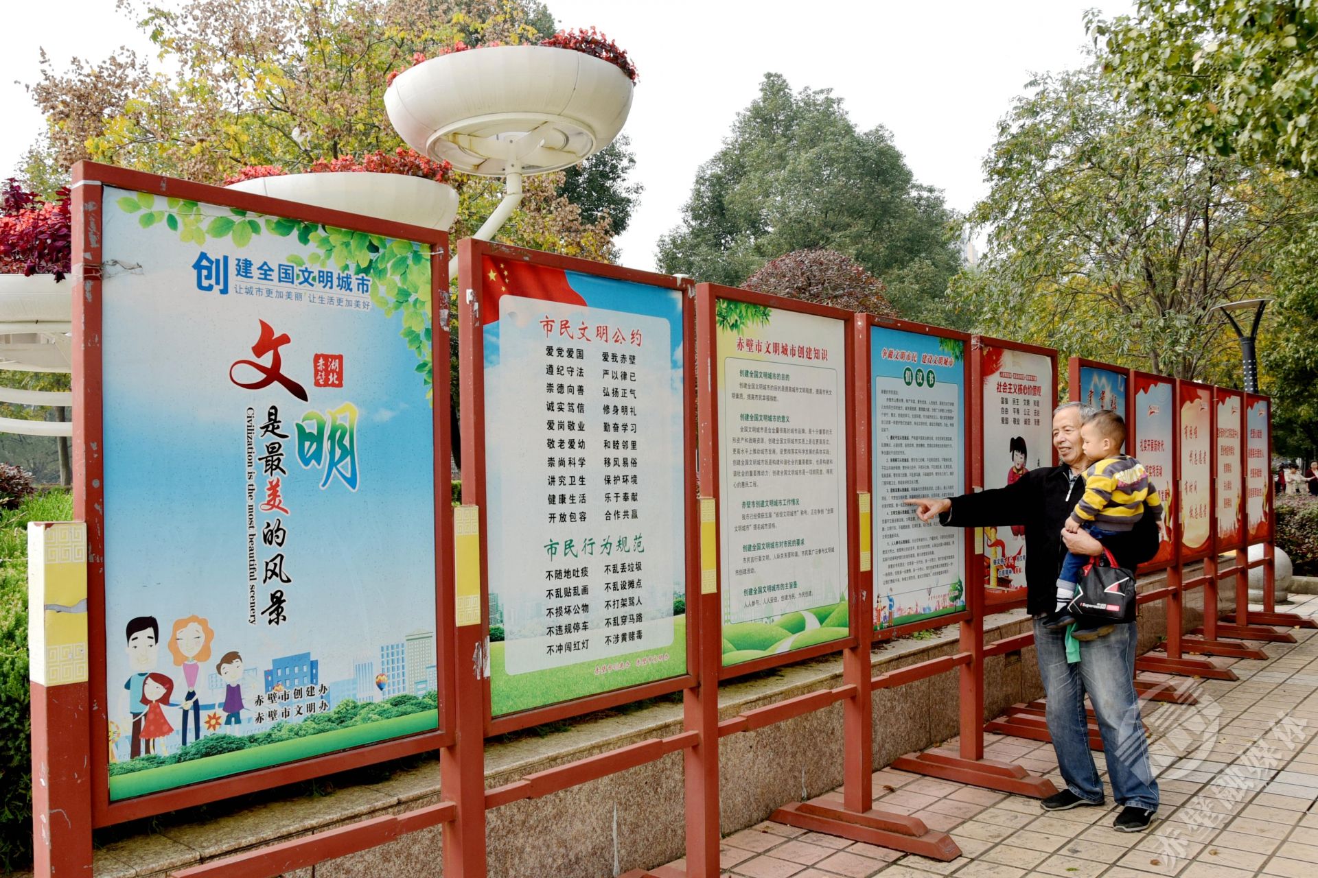 “今天帶孫子出來(lái)轉(zhuǎn)轉(zhuǎn),抬眼就看到這個(gè),正好教孫子認(rèn)認(rèn)字?!?0月29日,溜彎在人民廣場(chǎng)的羅爺爺指著文明創(chuàng)建宣傳展板開心的對(duì)記者說。