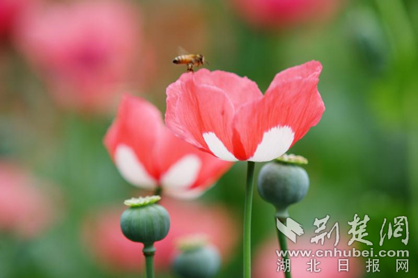 在罌粟屬的植物中,還有個常見的觀賞花卉虞美人,因為兩者花期一致,外形相似,常常被公眾混淆。在罌粟籠子的周圍,武漢植物園還種植了上白株罌粟的“姐妹花”虞美人,方便市民對比鑒別。