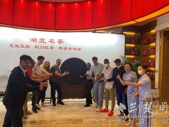 圖為在重達(dá)100多斤的赤壁青磚茶工藝品擺件前,國(guó)際友人一起合影留念。(通訊員供圖)
