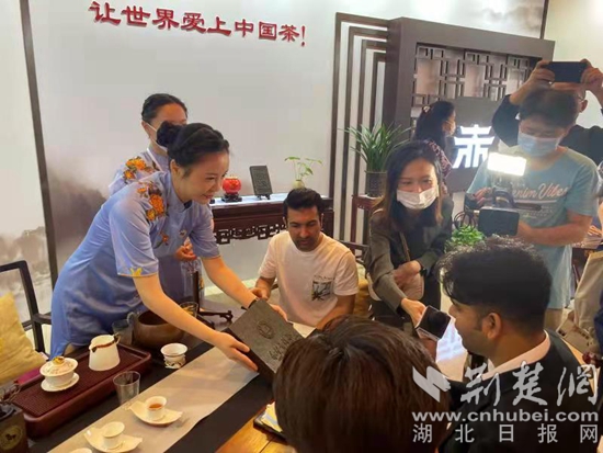 在高質(zhì)量互聯(lián)互通分論壇赤壁青磚茶展位,擠滿了前來品嘗赤壁青磚茶和茶點(diǎn)美食的嘉賓,茶藝師忙個(gè)不停,續(xù)杯、補(bǔ)充茶點(diǎn),向嘉賓介紹赤壁青磚茶的歷史和特點(diǎn),講解各類茶葉知識(shí)。