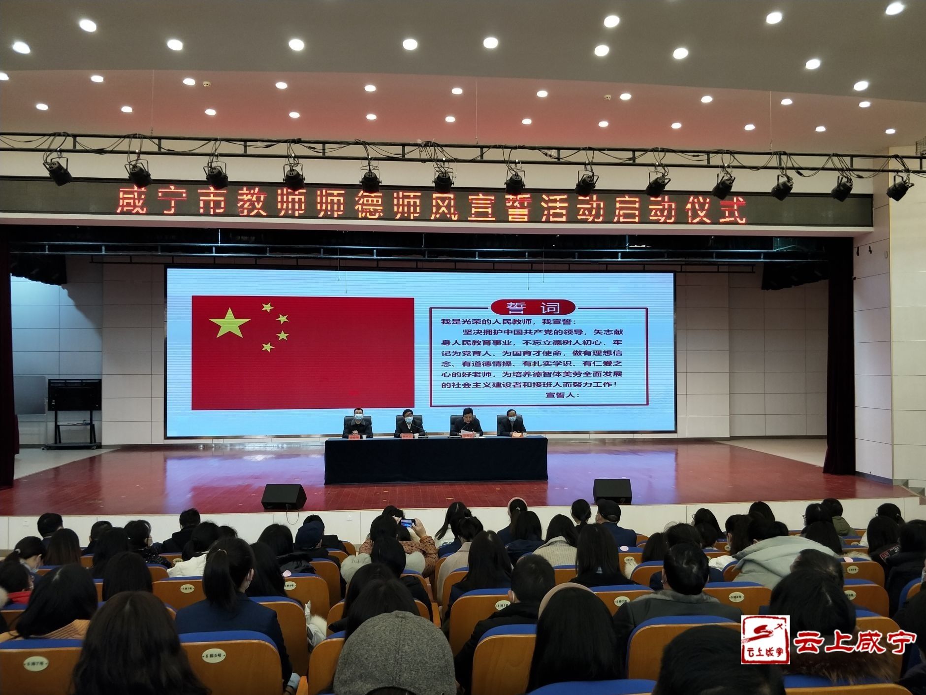 “我是光榮的人民教師,我宣誓……”1月19日上午,啟動儀式在市實驗小學報告廳舉行,咸寧市溫泉中學、咸寧市實驗小學所有在職教師面向國旗、莊嚴宣誓:牢記為黨育人、為國育才使命,做“四有”好老師。