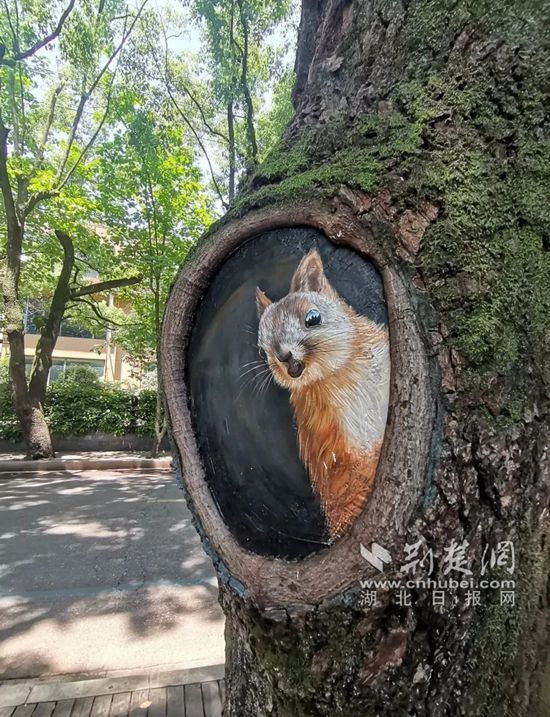 從溫泉谷到黨校入口處的山體雜草和垃圾已清理干凈,種上了耐陰的繡球花、彩葉草、網(wǎng)紋草等花草,展現(xiàn)出別樣風(fēng)情;街對(duì)面的道行樹上放上了仿真松鼠、貓頭鷹和桂花,樹洞橫截面“長滿”了松鼠、龍貓,淦河邊步道旁磚砌的窨井蓋因勢(shì)利導(dǎo),做成了樹樁的模樣,配上微塑蘑菇,幾可以假亂真;電箱穿上了風(fēng)景類的彩繪新衣……栩栩如生的小動(dòng)物和與周圍環(huán)境渾然一體的彩繪,讓新升級(jí)的月亮灣網(wǎng)紅路“萌化”了!