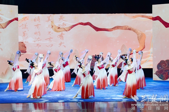 舞蹈《且吟春雨》《看了你一眼》婀娜曼妙,韻味十足。舞蹈《把愛(ài)寄回家》纏綿婉轉(zhuǎn),真情再現(xiàn)了一群留守兒童收到父母的快遞,思念父母的情景,表達(dá)留守兒童的心聲和期盼,呼吁社會(huì)給予他們更多的關(guān)愛(ài)。舞蹈《楚鼓聲聲》鏗鏘有力,再現(xiàn)了泱泱大國(guó)威武雄風(fēng)。