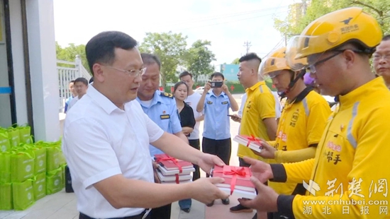 儀式上,紅安縣委常委、組織部部長余宏波向外賣騎手代表贈送黨的二十大精神學(xué)習(xí)資料及愛心物資。