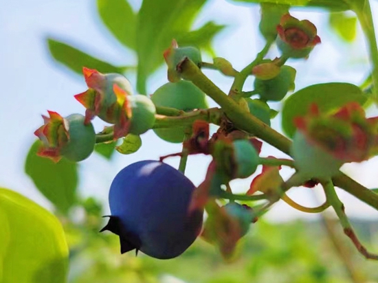 湖北藍莓看黃梅,黃梅藍莓看停前,停前藍莓看童寨。童寨藍莓基地,年產量可達 500萬噸,已開發(fā)出藍莓汁、酒、醬等產品,3A級藍莓采摘園已完成創(chuàng)建申報。