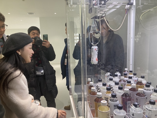采風(fēng)團(tuán)一行走進(jìn)元?dú)馍窒虒幑S,通過沉浸式觀光通道,一行人零距離感受生產(chǎn)過程,只見飲料生產(chǎn)線正高速運(yùn)轉(zhuǎn),一瓶瓶飲料飛速被裝進(jìn)箱子里,統(tǒng)一打包進(jìn)入倉庫。