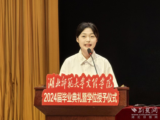 根據(jù)安排,現(xiàn)場分別宣讀了《關(guān)于授予2024屆畢業(yè)生學士學位的決定》和《關(guān)于表彰2024屆優(yōu)秀畢業(yè)生的決定》。隨后,優(yōu)秀畢業(yè)生代表劉佳欣、優(yōu)秀在校生代表聶菁蕓、優(yōu)秀校友代表李震威、教師代表肖燕琴分別發(fā)言。