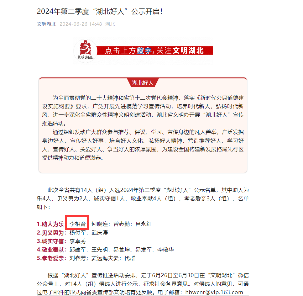 荊楚網(wǎng)(湖北日報(bào)網(wǎng))訊(記者呂鑒蕾 通訊員華文莉)6月26日,2024年第二季度“湖北好人”名單集中公示,全省共有14人(組)上榜。其中,黃石開發(fā)區(qū)·鐵山區(qū)汪仁鎮(zhèn)磊山村村民李相育榜上有名。