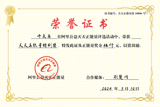 荊楚網(wǎng)(湖北日報(bào)網(wǎng))訊(記者呂鑒蕾 通訊員黃旺宣、文娜)9月10日,荊楚網(wǎng)(湖北日報(bào)網(wǎng))聯(lián)合阿里公益天天正能量,為“鑰匙姑娘”于文英頒發(fā)“天天正能量特別獎(jiǎng)”,獎(jiǎng)勵(lì)現(xiàn)金5000元。