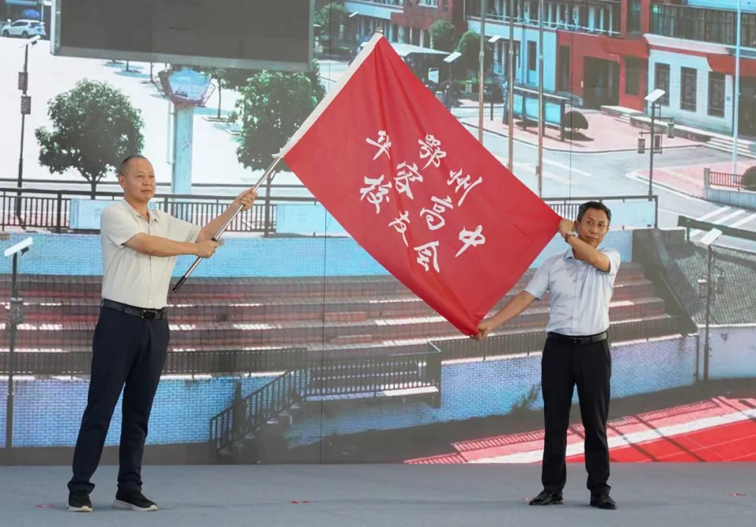 華容高中校長(zhǎng)姜?jiǎng)亠w向校友代表授旗