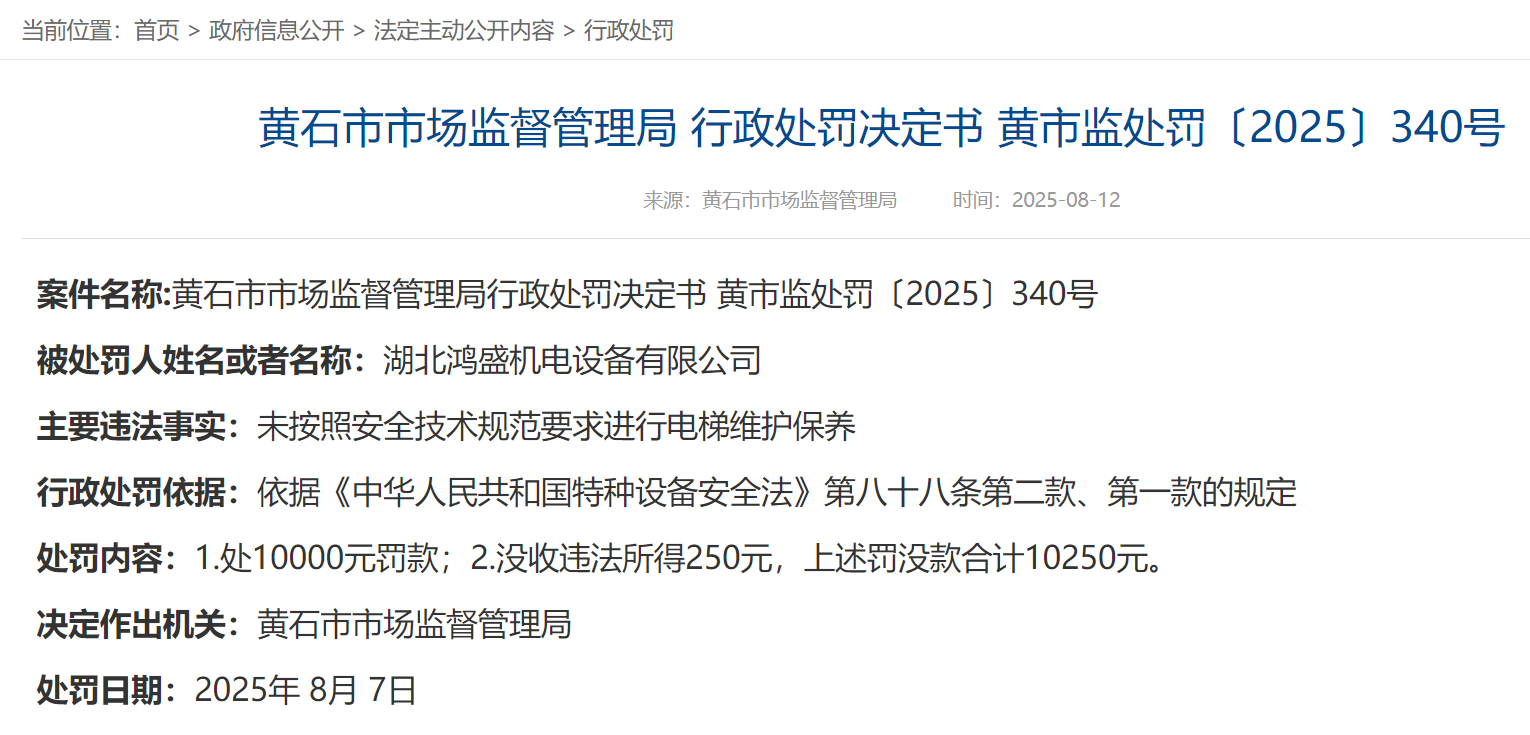 公告顯示,三家受處罰企業(yè)分別為湖北鴻盛機(jī)電設(shè)備有限公司、黃石市中信電梯工程有限公司和深圳市開元科創(chuàng)樓宇科技有限公司。主要違法事實(shí)均為“未按照安全技術(shù)規(guī)范要求進(jìn)行電梯維護(hù)保養(yǎng)”。依據(jù)《中華人民共和國特種設(shè)備安全法》第八十八條第二款、第一款的規(guī)定,黃石市市場監(jiān)督管理局在統(tǒng)一作出處10000元罰款的同時(shí),還分別對(duì)三家違法企業(yè)分別處以沒收違法所得250元、258.33元、282.27元。