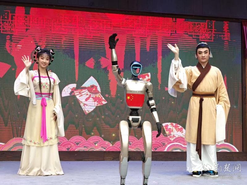 荊楚網(wǎng)(湖北日報網(wǎng))訊(通訊員王晶、費留燦)國慶中秋假期,在黃梅縣東山問梅村,當(dāng)黃梅戲《女駙馬》的經(jīng)典唱段響起,機器人踩著婉轉(zhuǎn)唱腔靈活擺臂、轉(zhuǎn)身,復(fù)刻戲曲身段的韻味;戲腔未落,身著傳統(tǒng)獅頭裝扮的機器狗躍至臺前,跟著鼓點騰躍撲閃,鬃毛翻飛間盡顯靈動,引得游客紛紛舉手機拍攝,鏡頭緊追這些“特殊演員”。