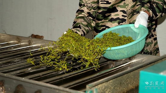 “我們現在是茶葉豐收期,所以我們生產車間都是24小時運轉,工人都是三班倒,確保每天能產干茶600多斤?!?蘄春蟹子地茶業(yè)有限公司總經理吳風長高興道。