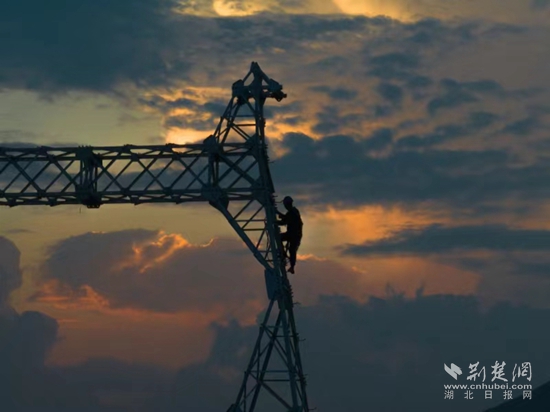 荊楚網(wǎng)(湖北日報網(wǎng))訊(通訊員曹祥魁 袁勝)8月23日下午5點,黃石陽新縣陶港鎮(zhèn)祠堂畈附近,40多米高鐵塔上4名電力工人渾身濕透,他們扶著頭頂上吊車吊過來的鐵部件,開始了最后“一吊”的組塔工作。