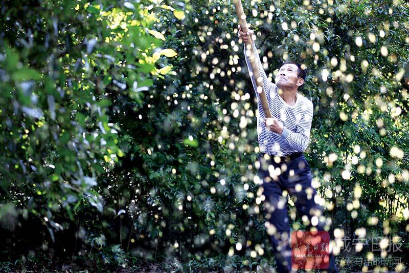 10月19日早上7時許,咸安區(qū)桂花鎮(zhèn)的村民們,扛起竹篙,帶上棚布,歡快的上山打桂花。