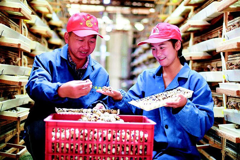 10月29日,在通城縣沙堆鎮(zhèn)石沖村,貧困戶游明夫妻在撿鵪鶉蛋。在鎮(zhèn)村干部的幫扶下,游明自學(xué)養(yǎng)殖鵪鶉技術(shù),利用空閑廠房辦起了養(yǎng)殖場(chǎng),并提供鵪鶉種苗,傳授養(yǎng)殖技術(shù),帶動(dòng)周邊村6戶貧困戶一起脫貧致富,助力鄉(xiāng)村振興。(視界網(wǎng) 劉建平 攝)