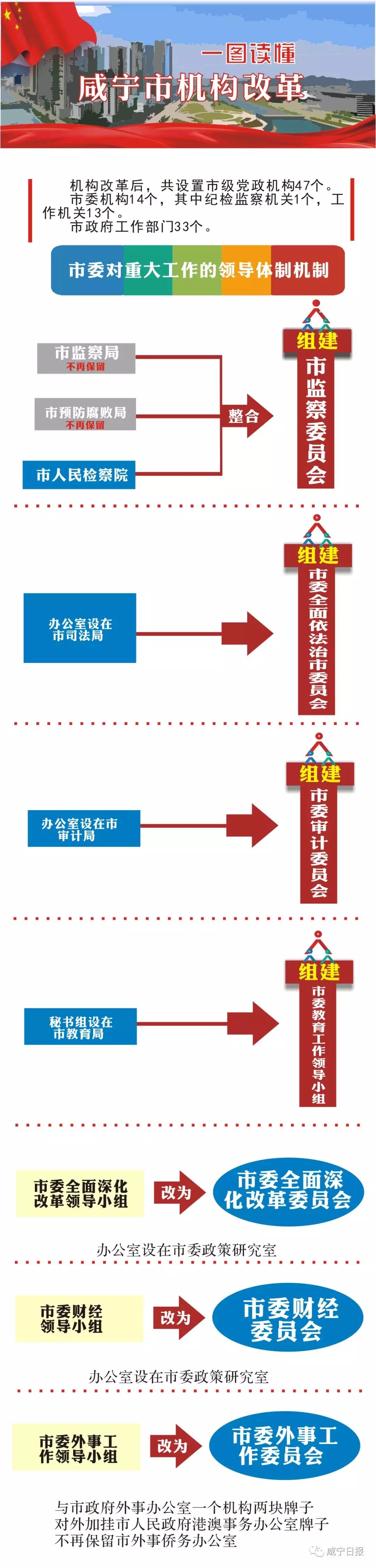 我市召開機(jī)構(gòu)改革動(dòng)員大會(huì),標(biāo)志著我市機(jī)構(gòu)改革全面啟動(dòng)。根據(jù)省委省政府批準(zhǔn)的《咸寧市機(jī)構(gòu)改革方案》,本輪機(jī)構(gòu)改革后,市本級共設(shè)置黨政機(jī)構(gòu)47個(gè)。市委機(jī)構(gòu)14個(gè),市政府工作部門33個(gè)。改革方案還對黨政直屬事業(yè)單位實(shí)施了限額管理,并進(jìn)一步規(guī)范了黨政派出機(jī)構(gòu)置。