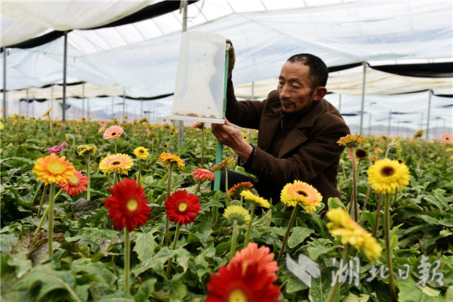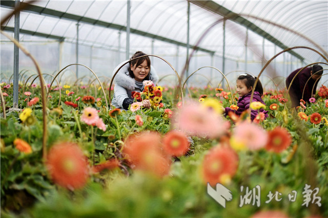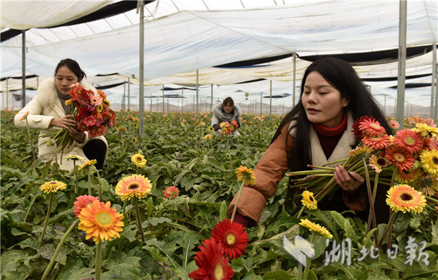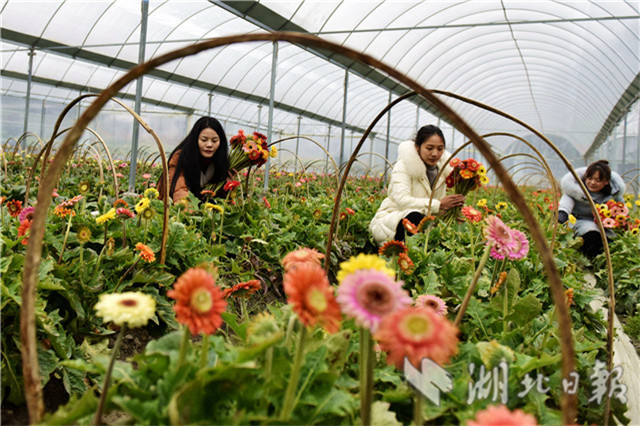 2月20日,湖北省通城縣石南鎮(zhèn)賽公村非洲菊種植專業(yè)合作社社員在采摘非洲菊供應(yīng)市場(chǎng)。