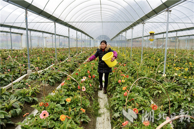 2月20日,通城縣石南鎮(zhèn)賽公村非洲菊種植專業(yè)合作社社員在采摘非洲菊供應(yīng)市場(chǎng)。該基地是當(dāng)?shù)胤掂l(xiāng)創(chuàng)業(yè)青年2016年底流轉(zhuǎn)100畝山地興建的,共有大棚90個(gè),種植非洲菊近十個(gè)品種,可年產(chǎn)鮮花1000余萬(wàn)棵,暢銷武漢、岳陽(yáng)等周邊城市,畝純收入2萬(wàn)元。(視界網(wǎng)劉建平攝)
