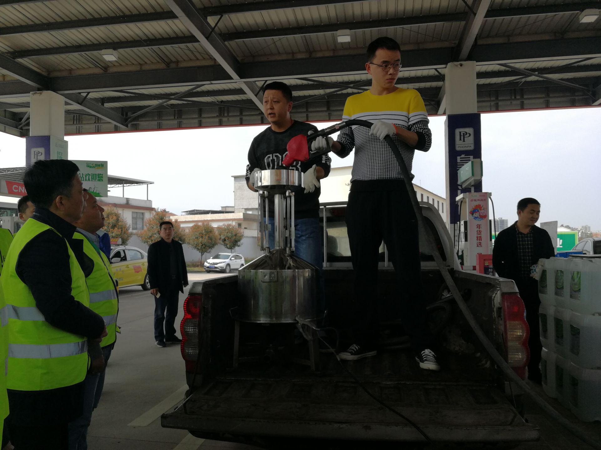 圖:咸寧市質(zhì)監(jiān)部門正在對賀泉加油站的加油裝置進(jìn)行檢測。