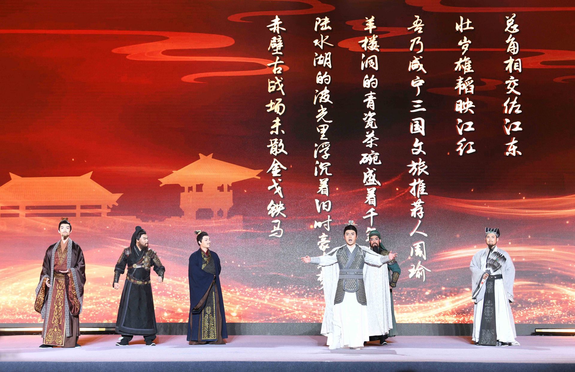 “三國六城,今日結(jié)盟!與君共同開啟,荊楚三國文化之旅?!眴?dòng)式上,身著古裝的文旅推薦官,化身三國英雄劉備、關(guān)羽、張飛、諸葛亮、孫權(quán)、周瑜等,穿越歷史時(shí)空,分別代表武漢、荊州、宜昌、襄陽、鄂州、咸寧對(duì)外推介各地三國旅游景點(diǎn)和線路。