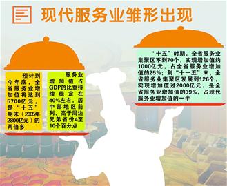 五年來,全省不斷改造提升傳統(tǒng)服務(wù)業(yè),大力發(fā)展需求潛力大的現(xiàn)代服務(wù)業(yè),鞏固提高商貿(mào)等支柱服務(wù)業(yè)的整體規(guī)模和水平,實現(xiàn)了多個新興行業(yè)和關(guān)鍵領(lǐng)域的重點突破,基本形成了二、三產(chǎn)業(yè)共同拉動經(jīng)濟又好又快增長的格局。省發(fā)改委表示,下一個5年,我省將力爭形成物流、旅游、金融、文化、信息、中介6個增加值或收入過千億元的現(xiàn)代服務(wù)業(yè)產(chǎn)業(yè),力爭服務(wù)業(yè)增加值實現(xiàn)過萬億元的突破,占全省GDP比重達到43%。