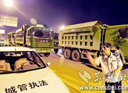 市城管局組織對大型渣土車夜查行動,被攔停的10輛渣土車中,清一色的車尾不掛牌,橫沖直撞。