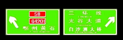 三環(huán)線由天興洲大橋往東新開發(fā)區(qū)光谷大道的一塊指路牌,左行指的是“關(guān)豹高速”,右行指的是“光谷大道”;但該路口左行是經(jīng)武黃高速去鄂州方向的,右行是經(jīng)三環(huán)線去白沙洲大橋方向的。路牌因信息不全、牌面又小,不少駕車人員到該路口時停車查看,不知行進(jìn)方向。