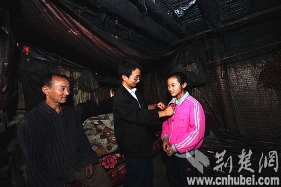 走進(jìn)半山腰家徒四壁的楊杰家,羅歡輕輕拉過小楊杰,給她系上一根紅繩。